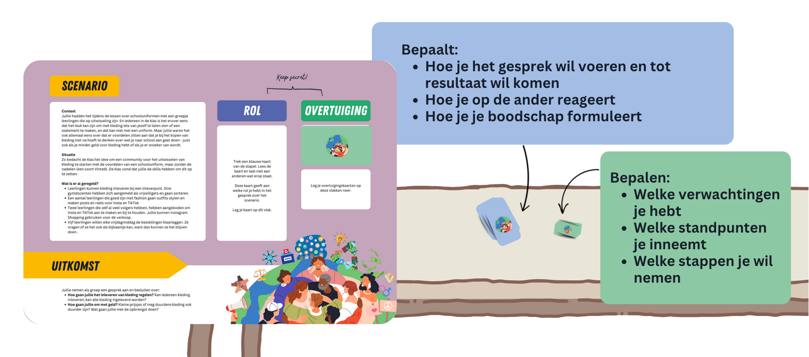 In onze eigen lerarenopleiding heeft vakdidactica Engels Nadia Gerritsen een game ontwikkeld waarin gespreksvaardigheden in een moderne vreemde taal — of in Nederlands als tweede taal — expliciet worden gekoppeld aan thema’s rond duurzaamheid, democratische participatie en mensenrechten. Het gaat om een rollenspel dat uitgaat van een scenario dat alle spelers kennen. Elke deelnemer krijgt twee individuele kaartjes: één met een communicatieve rol binnen de discussie (b.v. consensus-zoekend), en één met een overtuiging (b.v je toont altijd respect voor de meningen van anderen). De rol bepaalt hoe je moet spreken: dus hoe je reageert en welke taalregisters je inzet. De overtuiging bepaalt waar je voor staat, welke waardeoriëntatie je hanteert en welke doelen je – los van de communicatie – nastreeft. Een scenario gaat bijvoorbeeld over het organiseren van een ruilmarkt voor tweedehands kleding op school. Leerlingen moeten samen bedenken hoe zo’n ruilbeurs eruitziet (een soort live-Vinted). Vanuit die combinatie — rol en overtuiging — moeten leerlingen tot een uitkomst komen. Ze krijgen in hun kaarten ook voorbeeldzinnen in de doeltalen. Ze moeten dus niet alleen goed luisteren, maar ook actief proberen te begrijpen hoe de communicatiestijl van de ander werkt. Je zit niet allemaal in hetzelfde register, en je deelt niet hetzelfde uitgangspunt. Door deze verschillende communicatiestijlen en overtuigingen op een veilige en speelse manier te beléven — dus niet alleen te analyseren — ontwikkelen leerlingen interculturele competenties. Ze krijgen inzicht in hoe mensen vanuit uiteenlopende perspectieven communiceren, hoe taal daarbij betekenis draagt, en hoe macht, positie en waardeoriëntaties in taal verweven zitten. En dat terwijl ze reflecteren op een onderwerp dat te maken heeft met duurzaamheid, bijvoorbeeld.